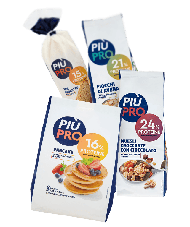 Gli esperti di nutrizione sono concordi: il primo pasto della giornata è il più importante. Allora cosa c’è di meglio, per chi ha una vita attiva e pratica sport, di una colazione fatta con i prodotti Più Pro arricchiti di proteine? Ce n’è per tutti i gusti ed esigenze, con percentuali proteiche differenziate ed evidenziate sulle confezioni: il pane, ideale per chi ama il gusto dolce, ma anche per chi preferisce il salato, che può essere accompagnato con una marmellata o un formaggio fresco, oppure, perché no? Con entrambi.