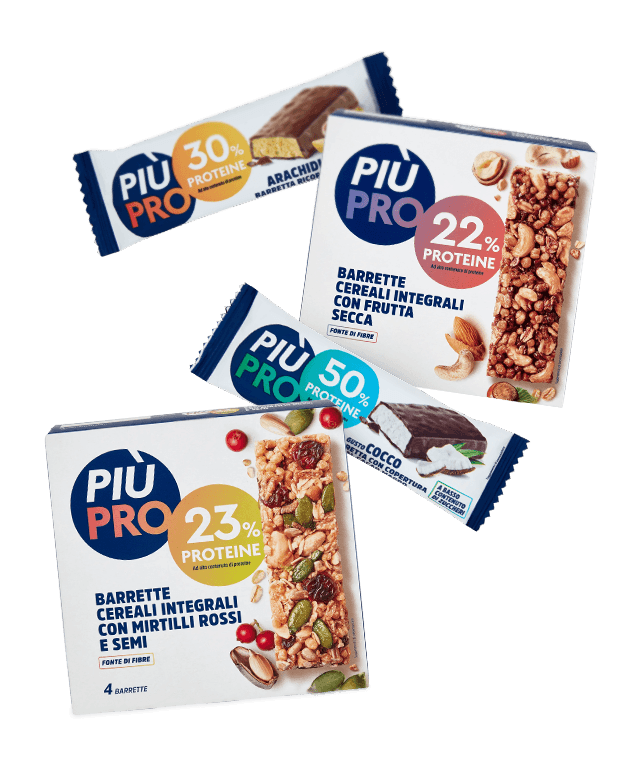 Una pausa veloce per “ricaricare le batterie” dopo l’attività sportiva? Una soluzione energetica da mettere nello zaino prima di affrontare una passeggiata nella natura? Le barrette Più Pro, pratiche da trasportare e comode da consumare on the go, sono la risposta ideale per gli sportivi, ma anche per chi ha l’esigenza di seguire un regime alimentare particolarmente ricco di proteine. L’apporto proteico fornito da ciascun prodotto è infatti evidenziato chiaramente su tutte le confezioni, per poter essere bilanciato nell’ambito di una dieta equilibrata.
