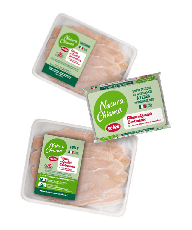 Non solo frutta e verdura. Per chi desidera seguire un’alimentazione onnivora nel rispetto dell’ambiente e degli animali, l’assortimento di Natura Chiama Selex da Filiera di Qualità Controllata comprende anche squisite carni bianche di pollo e tacchino e uova fresche da galline allevate a terra.