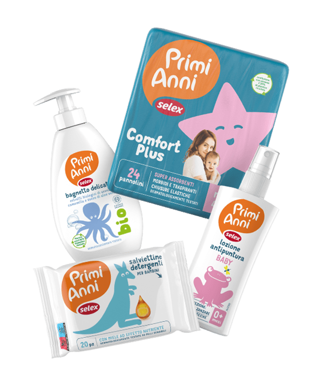 Primi Anni Selex è una linea specialistica nata per assicurare ai bambini dagli zero ai tre anni una crescita sana e sicura. La compongono infatti prodotti alimentari preparati esclusivamente con materie prime biologiche. La linea comprende inoltre articoli per l’igiene e la cura del corpo, tutti dermatologicamente e clinicamente testati per rispettare la pelle delicata dei più piccoli. I detergenti sono caratterizzati da ingredienti di origine naturale e biologica e i pannolini sono disponibili con una linea base e una di alta gamma. A questi si aggiungono infine alcuni prodotti per la pulizia e il benessere durante il cambio.